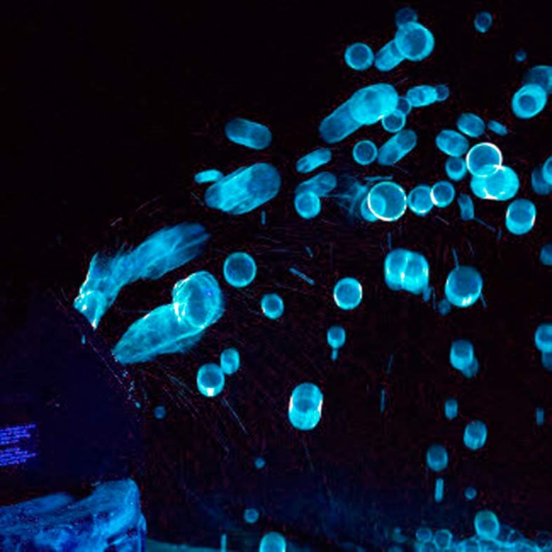 Las burbujas adquieren una tonalidad en azul claro cuando se iluminan con luz UV