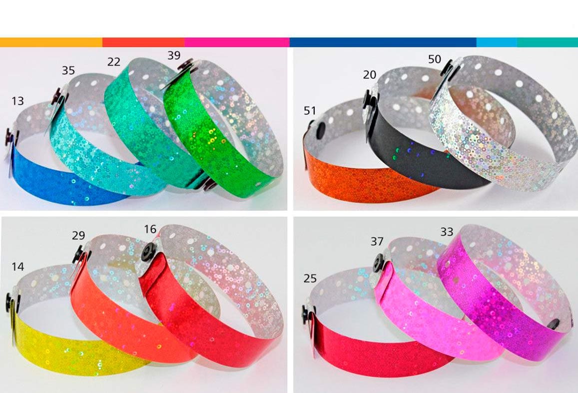 Pack de 500 u. de pulseras holográficas sin impresión. Hechas con 3 capas de plástico brillantes que crean destellos bajo los haces de luz.